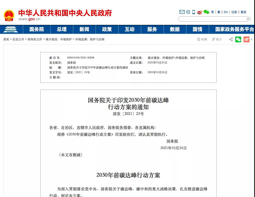 國務(wù)院關(guān)于印發(fā)2030年前碳達峰行動方案的通知