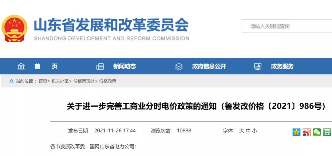 2022年1月1日起執(zhí)行!山東印發(fā)關(guān)于進(jìn)一步完善工商業(yè)分時電價政策的通知